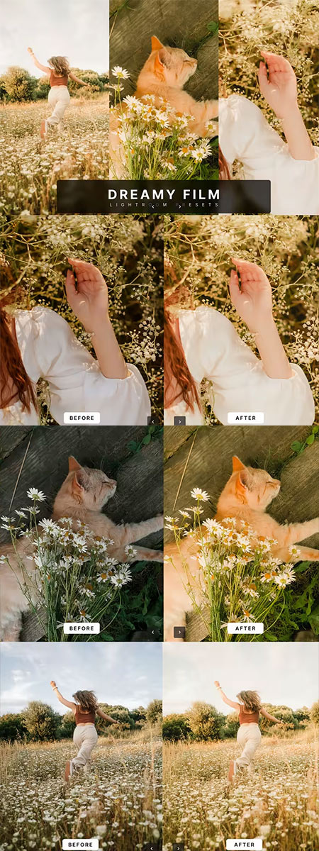 Dreamy Film Lightroom Presets PTYVR4V DNG, XMP | 1.21 MB This Lightroom preset captures the dreamy, cinematic feel of analog film with soft highlights, warm tones, and pastel hues. Perfect for romantic countryside scenes, it enhances golden hour light, delicate textures, and peaceful moments—like running barefoot through a daisy field, a cat napping in the sun, or fingers brushing wildflowers. Ideal for lifestyle storytellers, pet photographers, and slow-living creators, this preset brings a whimsical, serene aesthetic to nostalgic visual narratives. What’s Included 5 Adobe Lightroom & Photoshop Presets (.XMP) 5 Adobe Lightroom Mobile Presets (.DNG) Easy-to-follow installation guide Compatibility with Lightroom Desktop and Mobile Compatibility Adobe Lightroom Classic (version 7.3 or newer) Adobe Lightroom CC Adobe Lightroom Mobile App Adobe Photoshop (Camera Raw 10.3 or newer) Cross-platform: Desktop and Mobile, PC and Mac